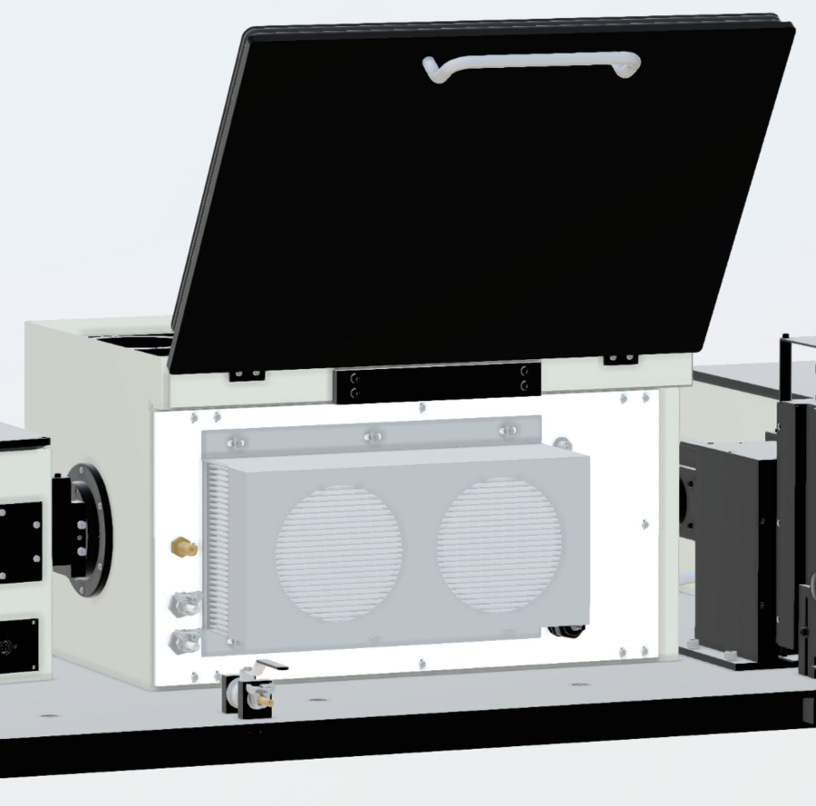 The conditioning source is based on a Xenon short arc lamp. The UV-rich light of the lamp passes through a rotating wheel that can place 4 customisable and lockable iris aperatures into the beam to attenuate the overall intensity. The attenuated light then passes through a rotating filter wheel, which can hold up to 6 filters to further control the spectrum of the conditioning beam. The light is guided to the water bath by fibre bundle, where it is collimated and shone onto the sample from two directions. Further spectral modulation is possible by partially covering the fibre bundle entrance with another filter. The source also houses a shutter.