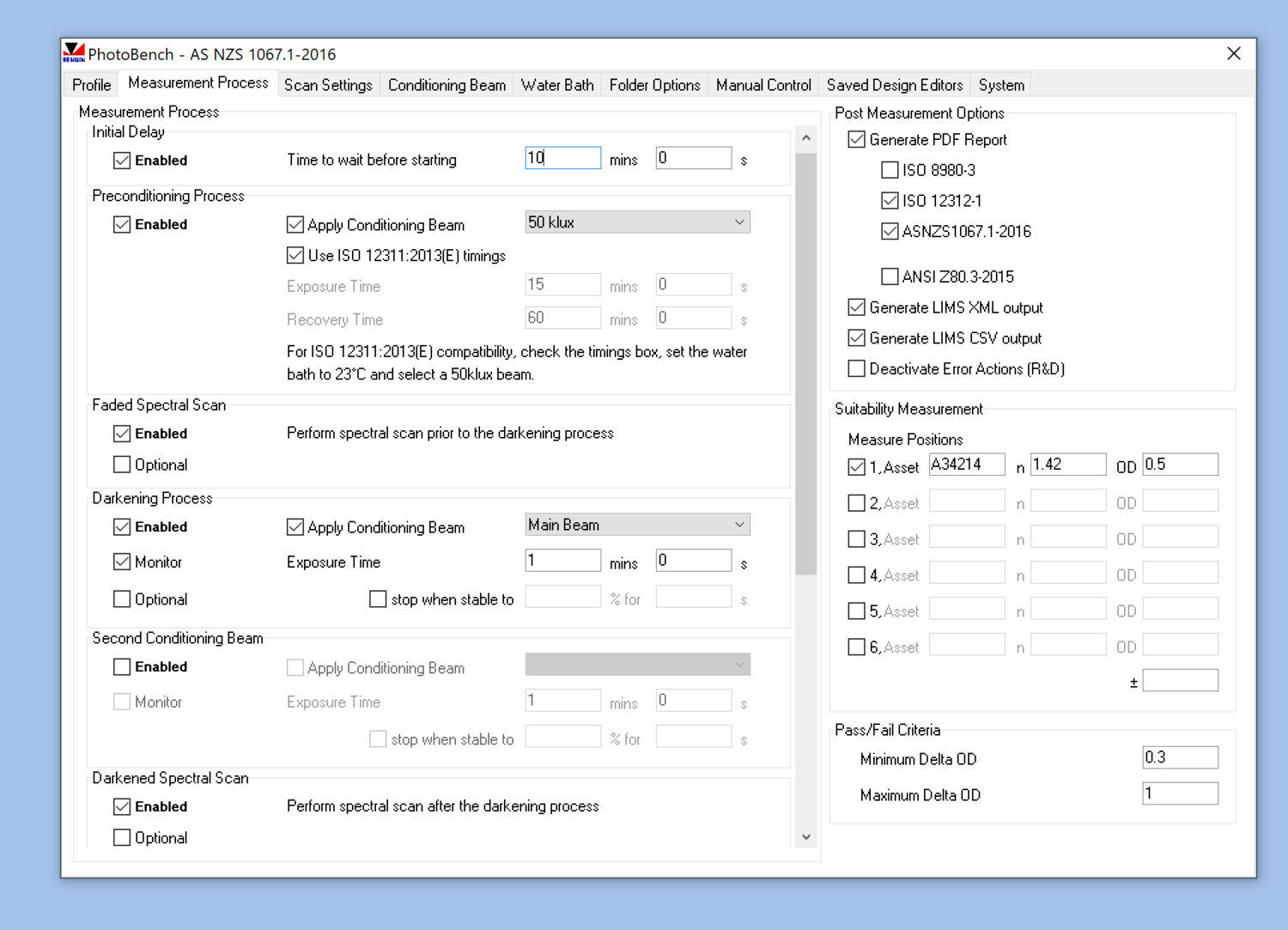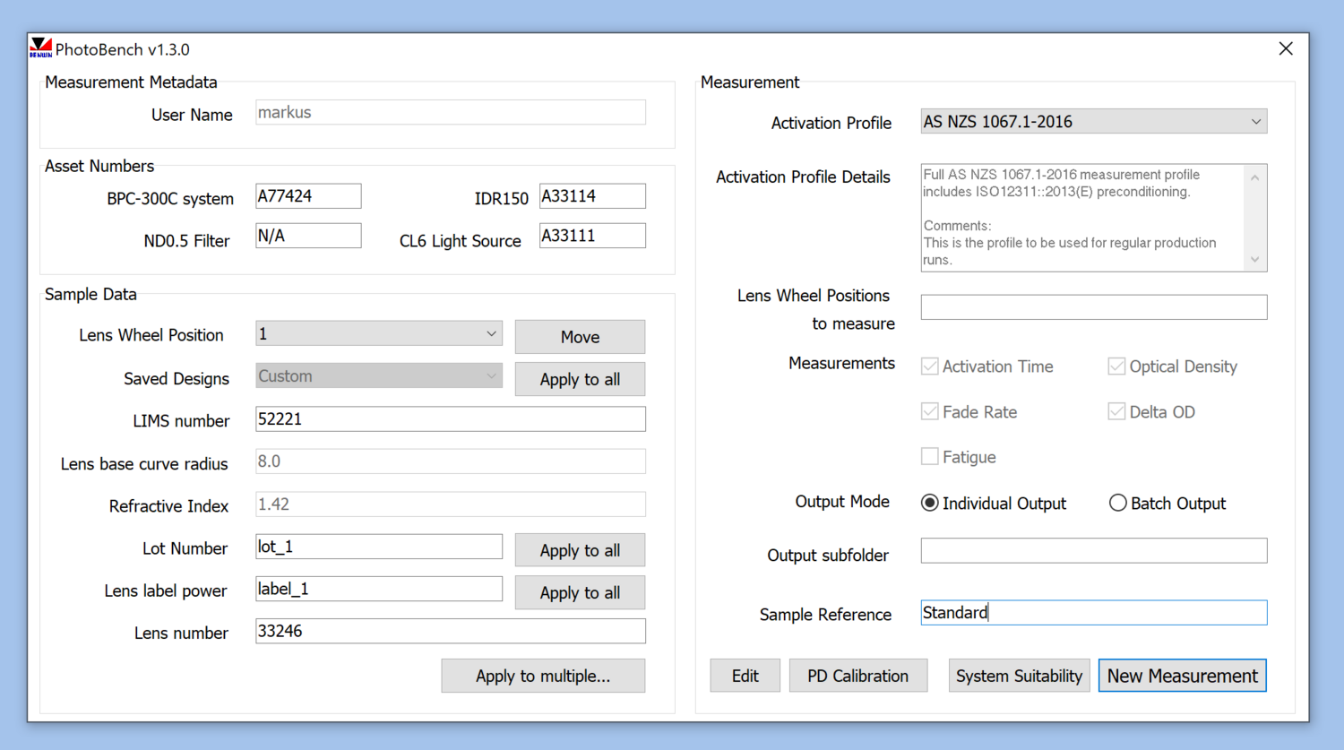 The BPC300-C is controlled via USB by Bentham's BPC300-C measurement and automation utility Photobench, an add-on to Bentham's popular BenWin+ spectral analysis suite. Photobench controls the BPC300-C hardware, measuring each lens automatically and sequentially by a standards compliant process, or by a process defined by your scientists. Once the measurements are complete, Photobench calculates relevant photometric values for each sample by standards compliant methodology, and presents these to the user as a PDF report or a computer-readable XML file.