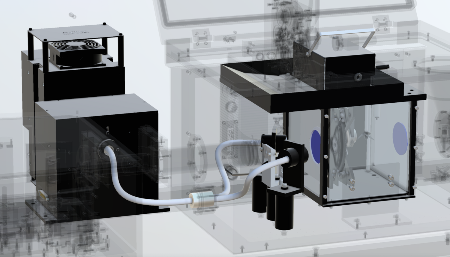 In order to simulate the effect of sunlight illuminating the sample, the light from a Xenon bulb is filtered, attenuated, and focused on the entrance of a fibre bundle. This bundle is split and both ends collimated and shone onto the same locations on the sample.